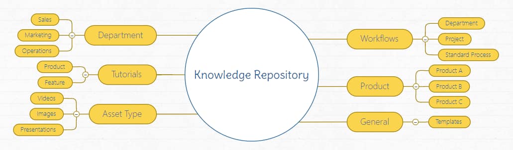 Also known as an inventory of knowledge, these linked resources make it easier for companies to collaborate on areas of expertise and advance their current understandings of a topic, procedure, or skill. Knowledge maps serve as a visual database representing ideas and their resources.